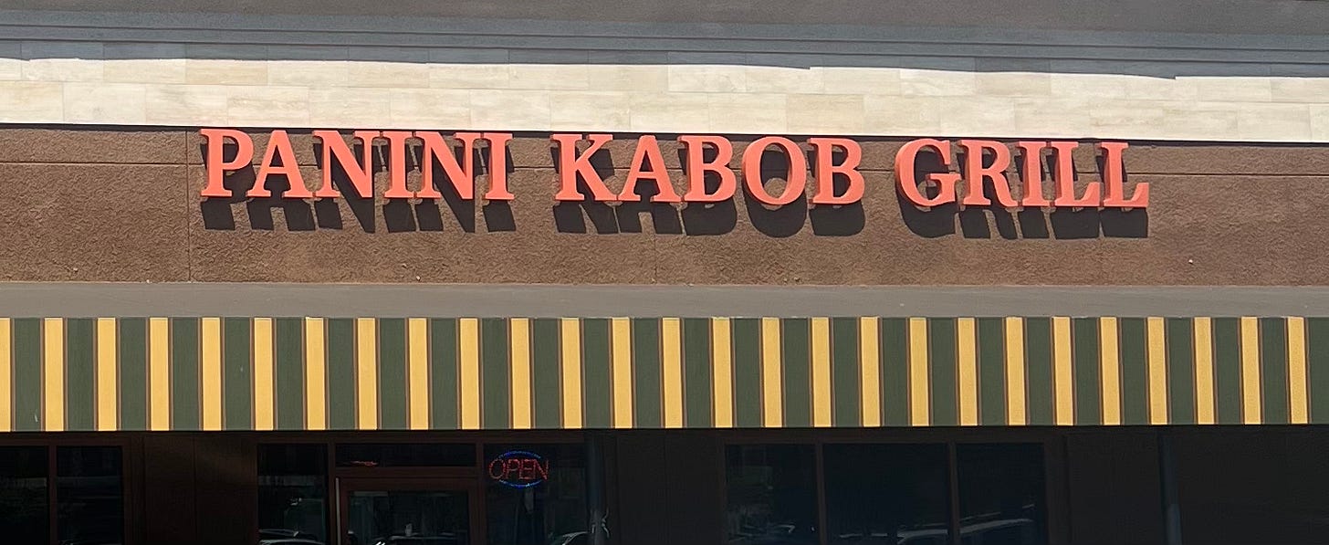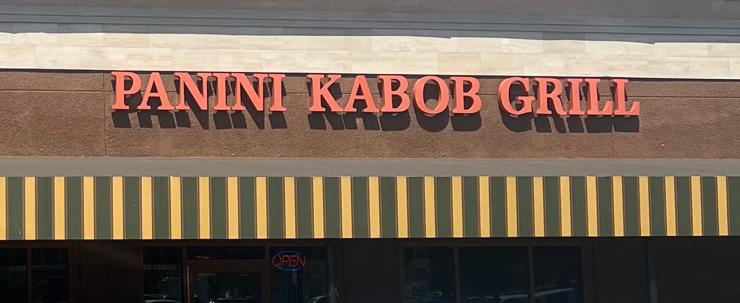 The three of us (Steve, Carnivore Sidekick, and myself) were recently sitting around talking about the sweltering heat and reminiscing about the Carnivore’s USD semester abroad in Athens and our visit there with him last school year. The talk went to the beautiful Mediterranean weather, lovely breezes, cool evenings, and especially the delicious food. We eventually decided to try and replicate the food by finding a good Mediterranean style restaurant we had not previously tried. We happened upon the Panini Kabob Grill, a relatively new restaurant in nearby Mission Valley (it replaced the Fuddruckers Restaurant about a year ago); the restaurant is located in the same shopping center as Trader Joe’s, DSW and the Coffee Bean.