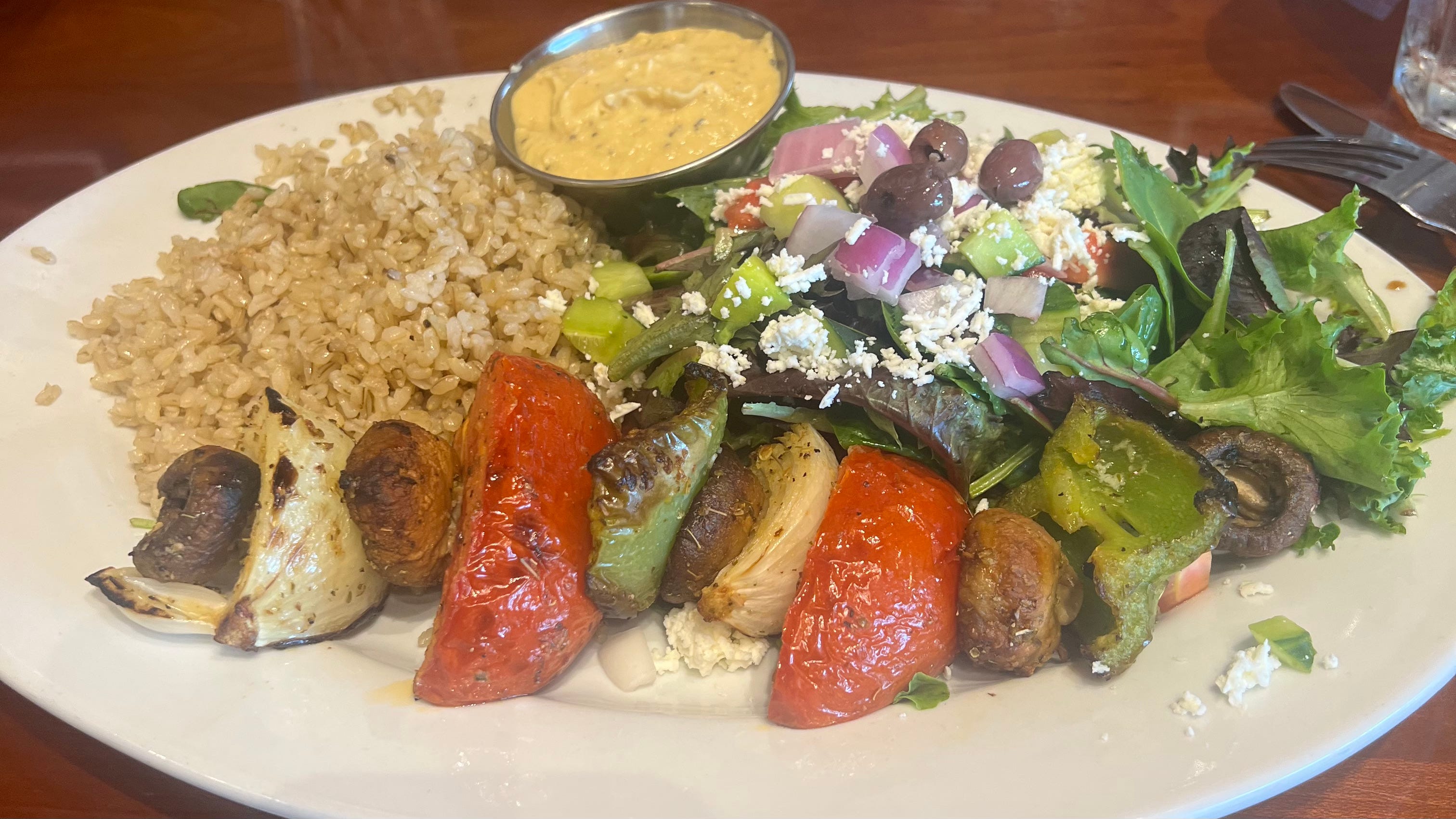 Steve ordered a mushroom kabab which included charbroiled white elder mushrooms, roma tomatoes, onions and bell peppers. It was served with brown rice and a side of hummus. He also had a Greek salad. He loved the kabob and is a fan of brown rice so he enjoyed his meal. I tasted his hummus and it was very creamy and delicious.