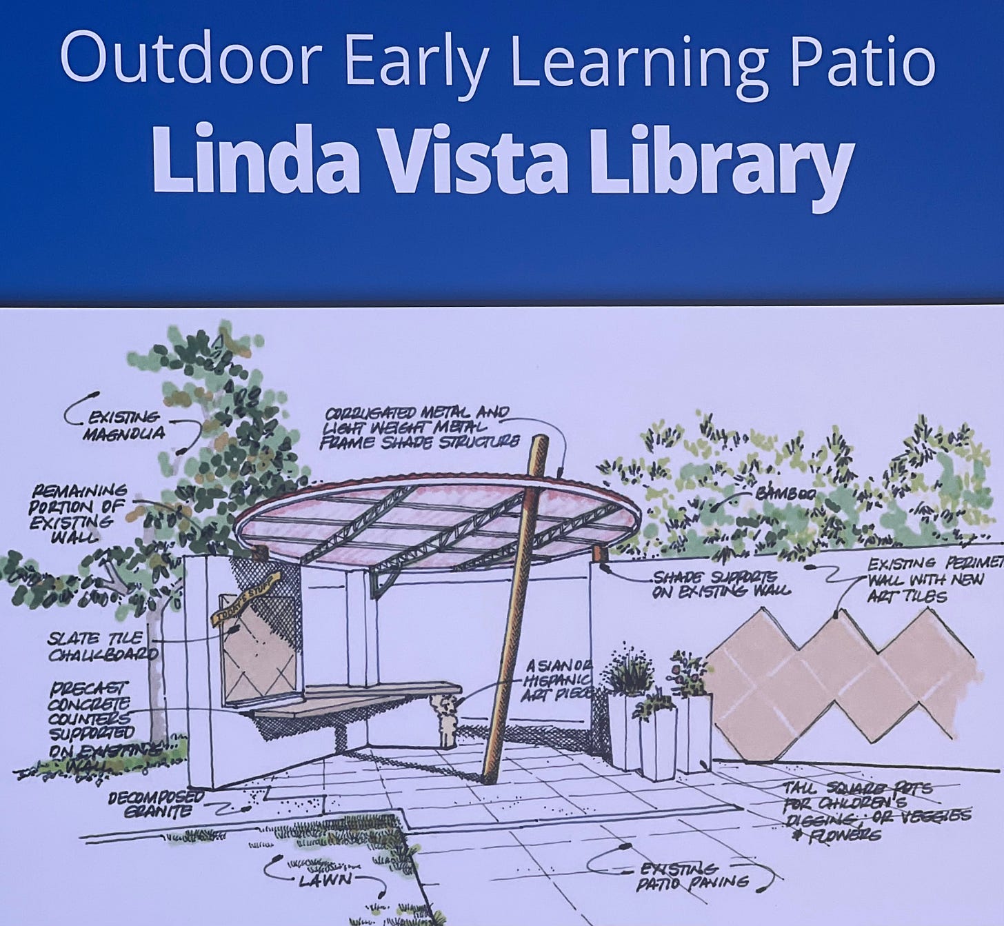This upgrade will involve expanding the outdoor children’s area and homework center at the Linda Vista Branch Library, and include the creation of an outdoor Early Learning Patio for young people. As illustrated in the above photo, the new patio will have a shaded structure, a chalkboard for instruction, concrete counters, art pieces, and additional plants.