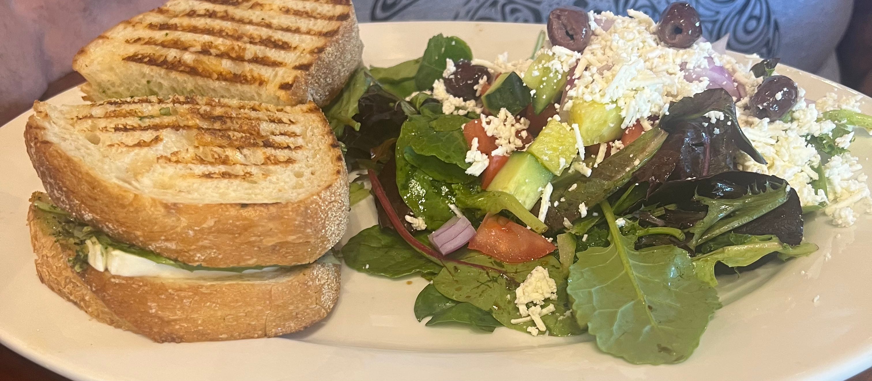 Since we had studied the menu on line, we knew what we wanted. I got the Caprese Panini which included buffalo mozzarella, roma tomatoes, fresh basil and homemade pesto. I got a Greek Salad as a side. The sandwich was delicious. There was a large slice of fresh mozzarella, excellent pesto and grilled just right on thick slices of bread. The salad was chock full of lettuce, tomatoes, cucumbers, feta cheese, olives, and an excellent dressing.