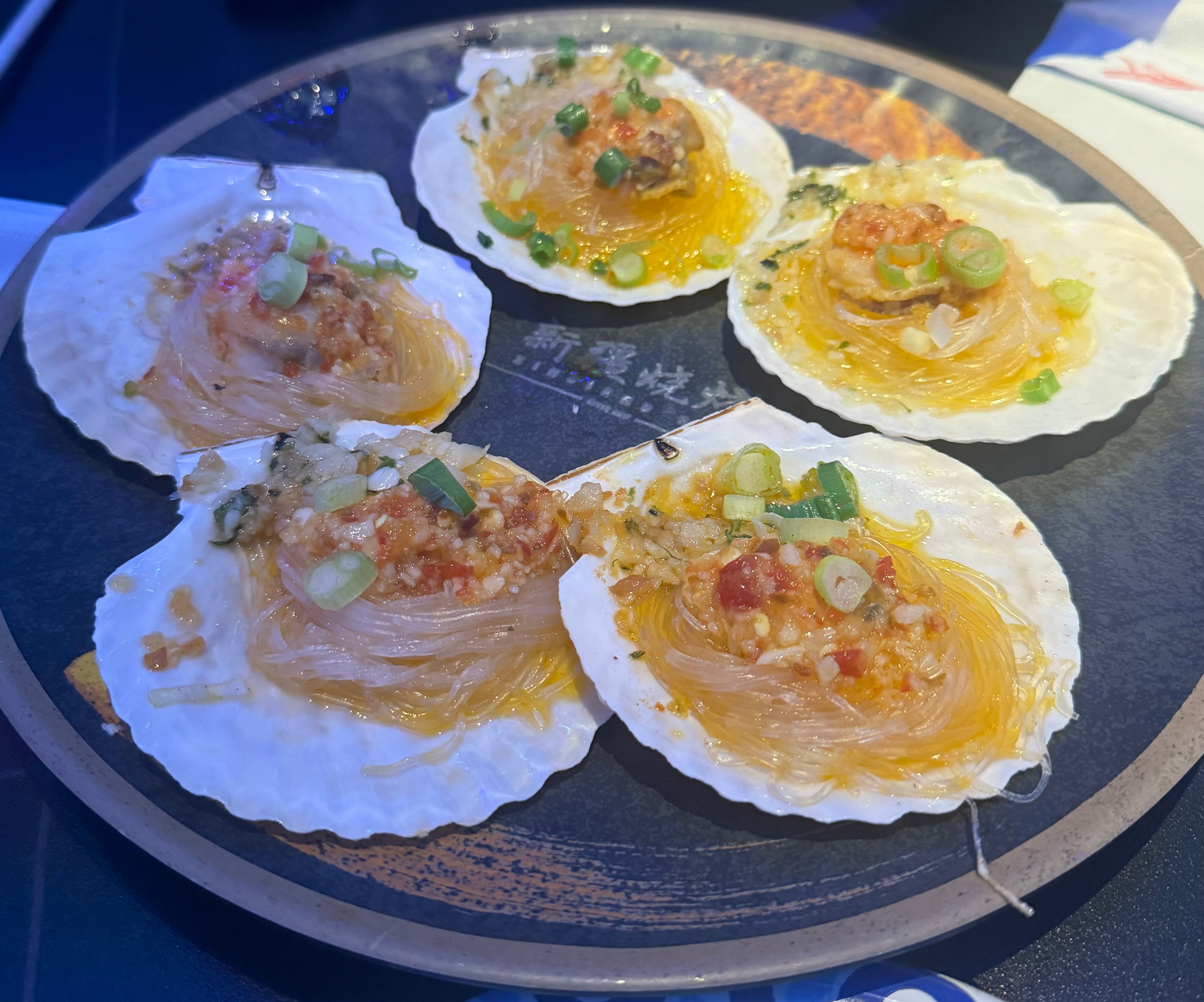 Each item came out at different times, as is common in some Asian restaurants. Each was presented beautifully and the tables were uncluttered with no condiments. Steve said his scallops were delicious. There were five of them beautifully served in a garlic sauce on a bed of very thin noodles. My eggplant looked elegant on the plate and was topped with a garlicky red sauce. It was excellent but very spicy so I put the rice on top to lessen the heat. I ended up giving a bit of it to the Carnivore since heat is his thing. He said the pork belly skewers were tasty and had a good crunch to them. The beef skewers were tender and nicely seasoned.