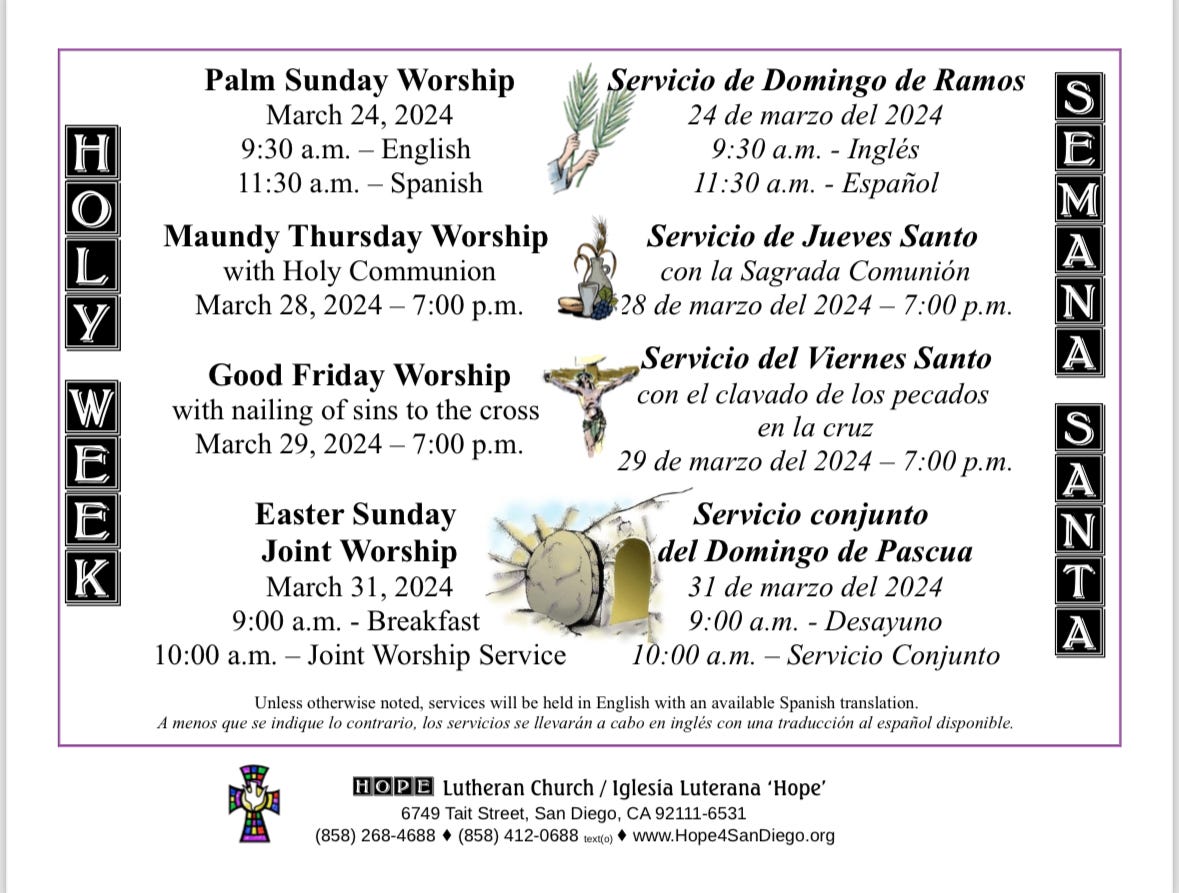 Hope Lutheran wishes to invite members of the community to their Eastern worship services today, Friday and Saturday and their Easter Celebration on Sunday. Please check out the schedule below.